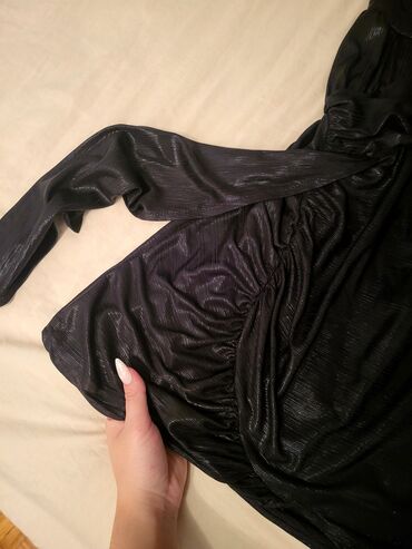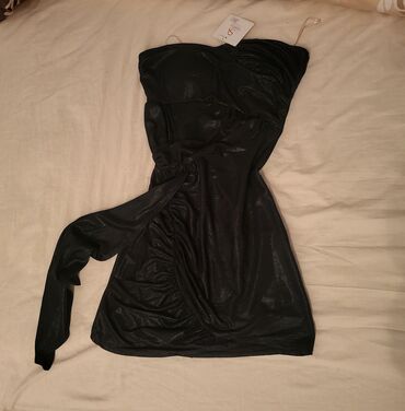 Elegantna crna mini haljina bez bretela, sa efektnim metalik sjajem. Asimetričnog kroja sa preklopom i nabranjima koja ističu struk i oblikuju figuru. Materijal je elastičan i prijatan, sa sitnim, diskretnim rebrastim teksturnim šarama koje daju dodatni sjaj pri kretanju. Na prednjem delu nalazi se dugačak drapirani panel koji pada preko suknje i stvara sofisticiran, večernji look. Idealna za izlaske, proslave i sve svečane prilike. Na etiketi je brend “Tally Weijl”.