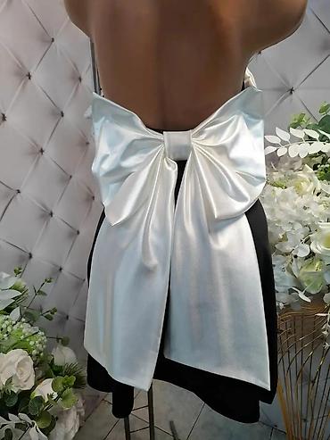 Svečana mini haljina sa mašnom na leđima - Kroj: A-linija, mini dužina, uski gornji deo sa ravnim izrezom i tankim, podesivim bretelama - Detalj: velika dekorativna mašna na leđima sa asimetričnim...