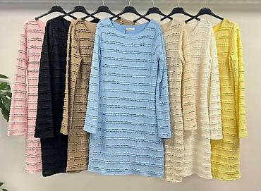 - Kroj: pripijena silueta, mini dužina, blago zaobljen okrugli izrez