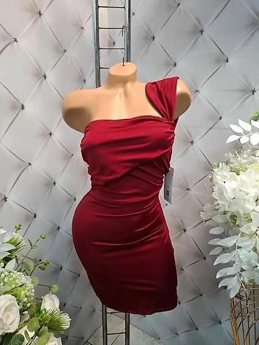 - Model: mini/kolenasta dužina, asimetričan kroj sa jednim ramenom i drapiranim naborima koji vizuelno oblikuju figuru