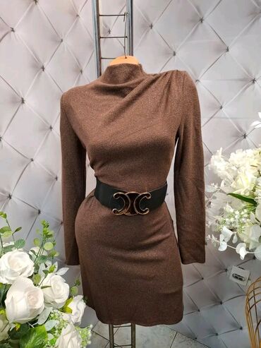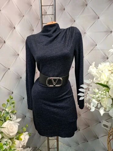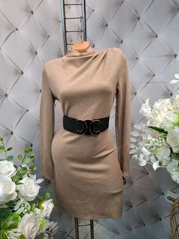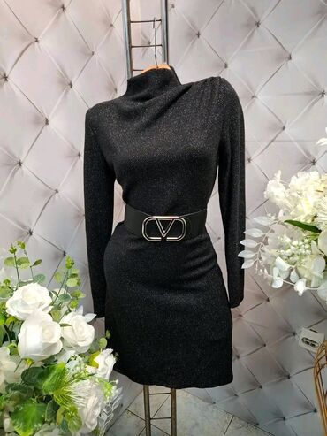 LetnjaElegantna ženska haljina sa dugim rukavima i asimetričnim naborom na ramenu. Model mini dužine, uskog kroja koji prati liniju tela. Visoka, meka rol-kragna pruža sofisticiran izgled, dok suptilan sjaj tkanine daje svečan, večernji ton.