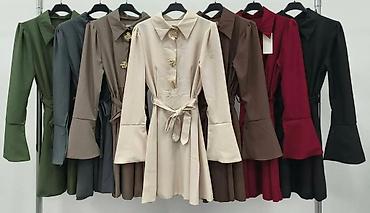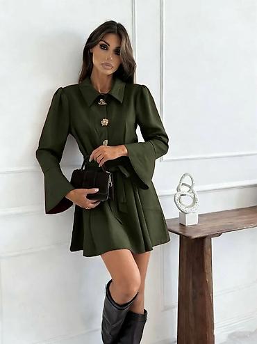 - Kroj: A-linija, mini dužina, struk naglašen uklonjivim pojasom u istoj tkanini.