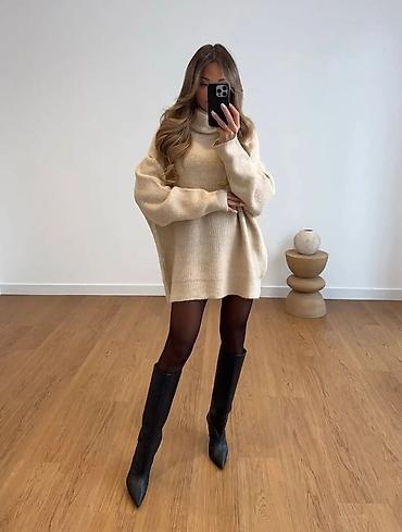 - Model: duža pletena džemper-haljina sa širokom, udobnom rol-kragnom