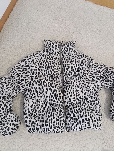 DžepoviPuf jakna sa animal printom (crno-bele tačkice, dalmatinski stil). Kratki kroj do struka, visoka kragna, punjene „puffer“ komore za dodatnu toplotu. Prednji centralni rajsferšlus sa crno‑belom trakom, dva kosa bočna džepa sa rajsferšlusom. Elastično nabrani rukavi sa izraženim puf efektom. Unutrašnjost crna, glatka postava.