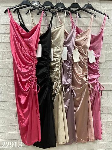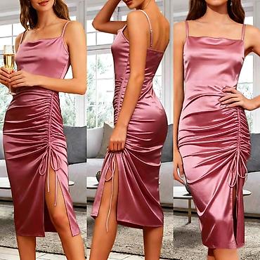 Saten haljina midi dužine sa efektom sjaja i prelepim padom. Model sa tankim bretelama i ravnim izrezom, prati liniju tela. Sa strane je dekorativno nabrana i ima podesivo učkur-nabor koji formira prorez do iznad kolena – možete prilagoditi visinu proreza i intenzitet nabora.