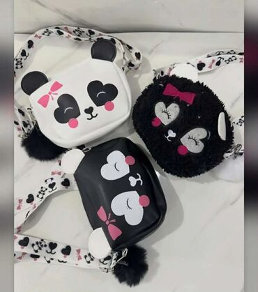 - Dečje/teen torbice panda motiva: pravougaone i okrugle varijante, aplikacije sa ušima i mašnicama, mešavina glatke i pliš teksture; podesiv šareni kaiš sa motivima pande; boje bela, crna i crno-bela.