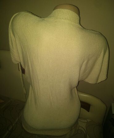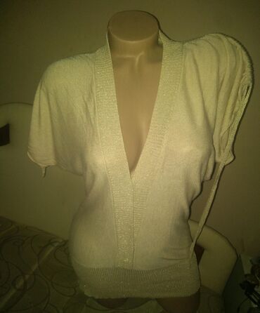 Gina Tricot zenska bluza zlatnih nijansi sa diskretnim sjajem Mekana, pletena tkanina s a šljokičastim nitima na rubovima: široka bordo-rub traka duž V-izreza i donjeg poruba. Krojen široko u ramenima sa kratkim, lepršavim rukavima i opuštenim padom, sužava se u struku i na donjem rubu radi naglašene siluete. Dužina ide do ispod kukova (tunika stil). Idealna za večernje izlaske ili svečanije prilike; lepo se kombinuje preko topa ili grudnjaka sa čipkom zbog dubljeg izreza. Boja i materijal daju elegantan, blago metalik efekat pod svetlom