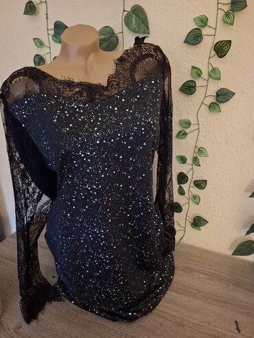 Crna mini haljina sa šljokicama i otvorenim leđima. - Kroj: uska silueta koja prati liniju tela, dužina iznad kolena - Materijal: elastična tkanina kompletno presvučena sitnim šljokicama raspoređe...