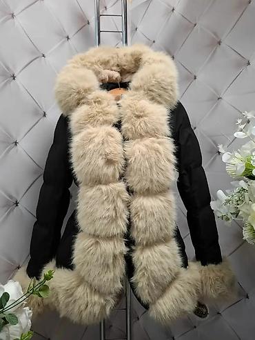 - Crna jakna sa širokim panelima od bež krzna duž prednjeg dela, kapuljače i rubova