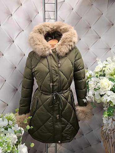 - Maslinasto zelena jakna sa dijamantskim prošivom, krznom na kapuljači i manžetnama, podesivim strukom na vezivanje i više džepova sa metalnim rajsferšlusima