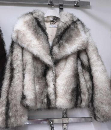 Bunda od veštačkog krzna, elegantnog izgleda sa uzorkom u beloj boji sa sivim prugama/tačkicama. - Kroj: ravni, dužina do kukova, široka rever-kragna. - Kopčanje: tri velika crna dugmeta sprijeda...