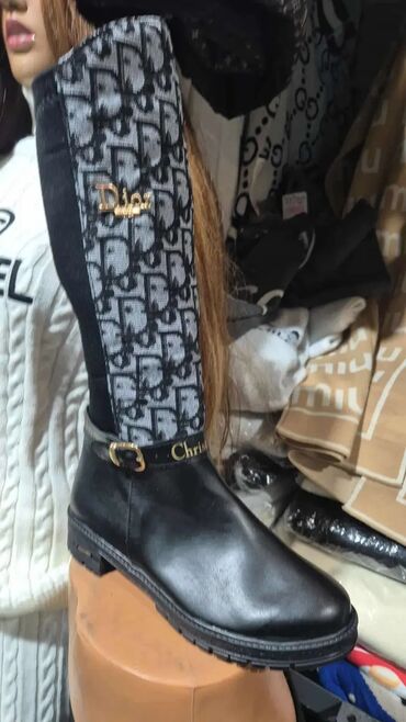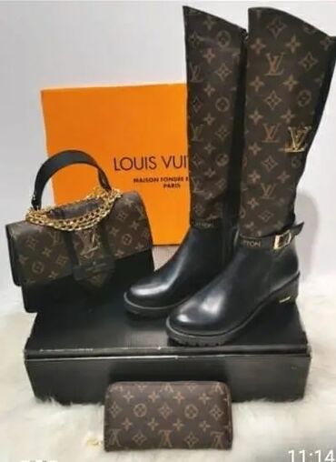 - Dizajn: klasične crne čizme do kolena sa ukrasnim monogram panelima i metalnim logotipima na gornjem delu, kao i kaišem sa kopčom i brendingom oko članka.