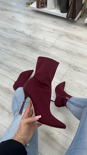 - Boje/prikaz: bordo (mat elastična tkanina koja prati nogu) i crna lak koža/visoki sjaj