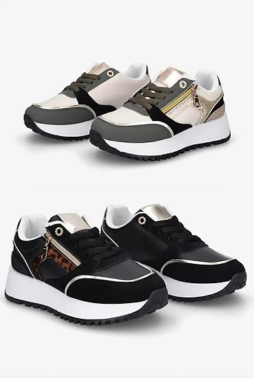 - Dizajn: trendi “chunky” silueta sa povišenim đonom i čistim linijama. Dostupne varijante: kombinacija bež/maslinasto sa zlatnim detaljima, crna sa leopard akcentom i metalik završnicom, kao i svetloplava sa belim detaljima.