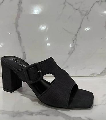 - Model 2: Mules sa blok potpeticom u svetlosivoj/bež nijansi, tekstura nalik denimu. Kvadratni vrh, širok preklop preko rista sa dekorativnim šavovima i metalnim nitnama. Stabilna četvrtasta peta pruža udobnost za celodnevno nošenje.