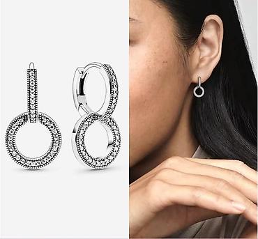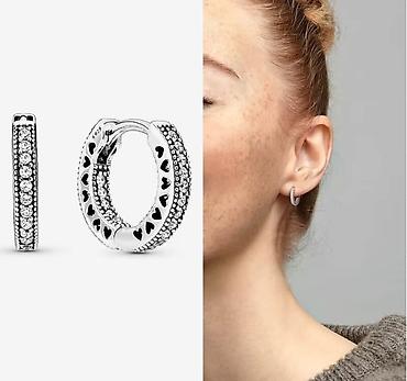 - Dizajn: Klasične obruče sa dvostrukim redom prozirnih kubnih cirkona na prednjoj strani. Unutrašnja ivica ukrašena izrezanim motivima srca. U kompletu dolazi dodatni kružni privjesak sa pavé ukrasom koji se može dodati ili skinuti, pa se minđuše mogu nositi kao: