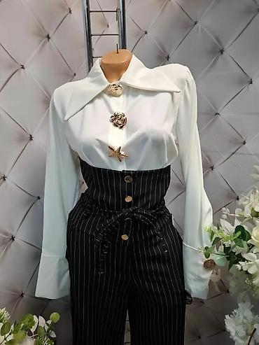 Elegantne ženske pantalone sa visokim strukom i širokim nogavicama i košulja - Kroj: visok struk, široke ravne nogavice, dužina do poda za izdužen siluetu - Detalji: diskretni nabori sprijeda, pas...