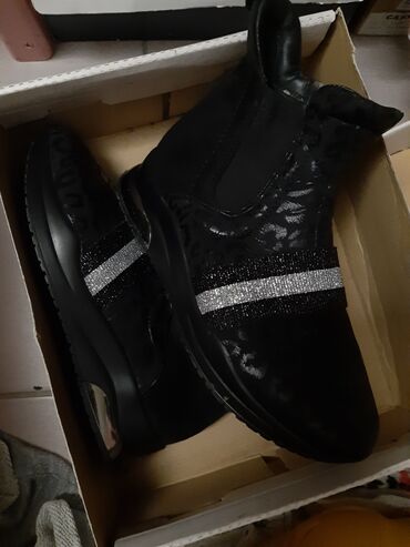 Diskretno upečatljiv model koji spaja komfor patike i izgled kratke čizme, sa sjajnim prugama koje dodaju dozu glamura.