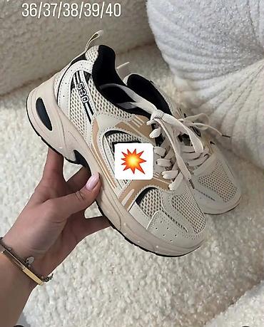 - Model 2: Bež/bele “530” trenerke sa mrežastim panelima za prozračnost i ojačanjima oko prstiju i pete. Klasično pertlanje, gumeni đon. Dostupne brojevi: 36, 37, 38, 39, 40.