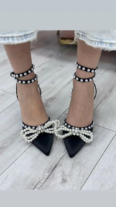 - Dizajn: dupli remenčići ukrašeni bisernim perlama; rub cipele i peta obrubljeni biserima