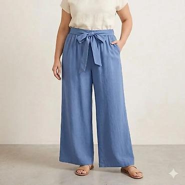 - Kroj: široke nogavice (palazzo), visoki struk sa elastičnom trakom za udobno pristajanje