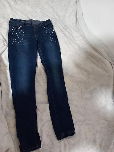 Ženske uske farmerke od tamno plavog denima sa elastinom. Klasik kroj sa srednjim strukom, uskim nogavicama i pet džepova. Napred, oko prednjih džepova, nalazi se dekor od sitnih i srednjih bisernih perlica raspoređen u šaru, dok je pozadi minimalističan izgled sa dva našivena džepa. Blago isprani efekti na bedrima i kolenima daju suptilan kontrast. Zatvaranje na rajsferšlus i dugme, paspul za kaiš. Idealne za svakodnevne kombinacije i večernje izlaske – lepo se uklapaju uz patike, čizme ili štikle.