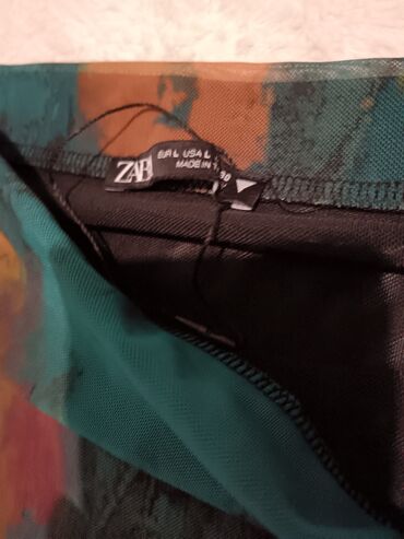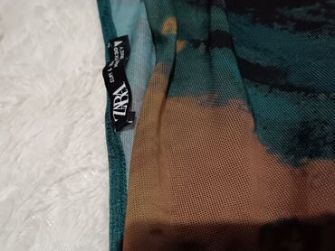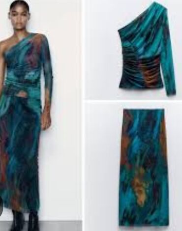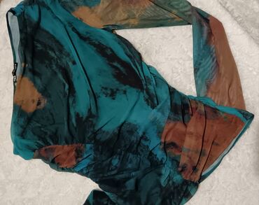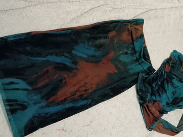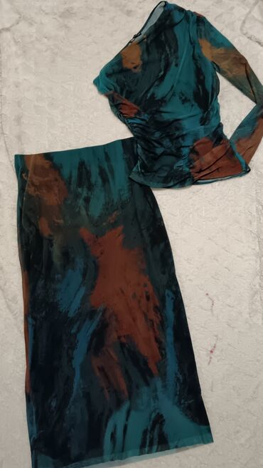 - Model: dvodelni set sa apstraktnim akvarel printom u nijansama tirkizne, petrolej zelene, crne i rđasto‑braon.
