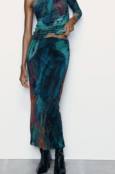 - Donji deo: uska ravna suknja dužine do članaka (midi/maksi), visok struk, isti elastičan, lagan i blago providan materijal kao bluza.