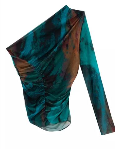 - Gornji deo: asimetrična bluza na jedno rame, jedna duga rukavica/rukav, drapirani nabori sa prednje strane, elastična mrežasta tkanina koja prati liniju tela, poluprovidan efekat.