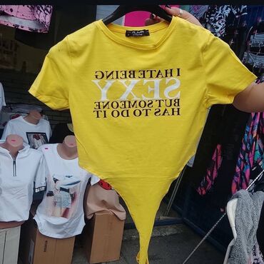 1) Žuti bodi sa natpisom “I HATE BEING SEXY BUT SOMEONE HAS TO DO IT” – crni i beli print napred.