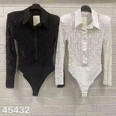 - Materijal: kombinacija teksturirane/čipkaste tkanine sa elastinom i glatkom poplin kragnom i manžetnama; donji deo od rastegljivog materijala sa kopčanjem.