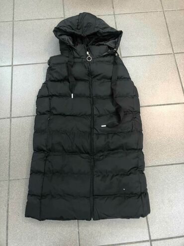 Dugačka ženska pufna prsluk-jakna bez rukava, crne boje. Veličine 40 -