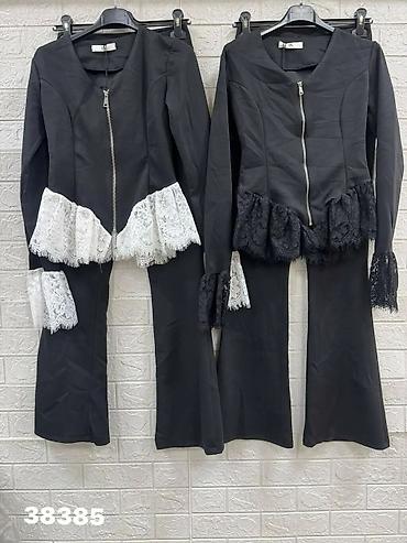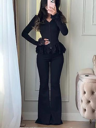 Damski komplet – sako sa rajsferšlusom i čipkom + zvonaste pantalone