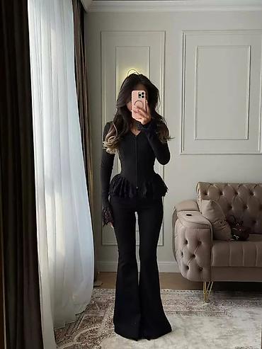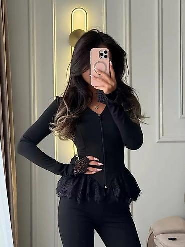 - Gornji deo: strukiran sako/bluza sa dugim rukavima, prednje kopčanje rajsferšlusom, V-izrez. Peplum porub sa bogatom čipkom oko struka i čipkasti završeci na rukavima daju ženstvenu, elegantnu siluetu.