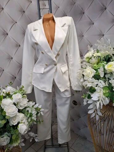 - Model: dvodelni komplet sa strukiranim sakoom i ravnim pantalonama do članaka