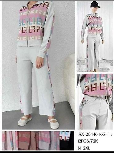 - Dvod elni set od mekog materijala: lagana dukser jakna sa rajsferšlusom i ravnim ovratnikom + široke trenerke srednjeg struka.