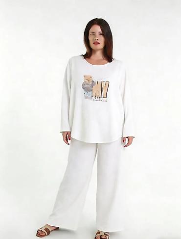 - Gornji deo: blago duža tunika sa printom medvedića i natpisom na prednjoj strani