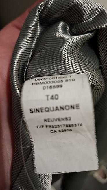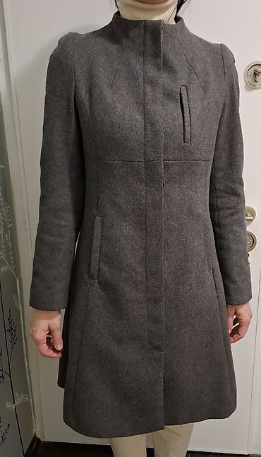 - SINEQUANONE ženski kaput, veličina T40 (oznaka na etiketi). Elegantna, strukirana silueta do kolena, uspravna kragna. Sive boje, klasičan kroj sa skrivenim kopčanjem, dekorativnim štepovima i ušivenim džepovima sa strane. Diskretan, glatki postav. Idealan za poslovne i formalne kombinacije.