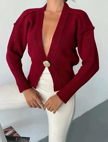 - Elegantni kardigan sa dubokim V-izrezom i jednim dekorativnim zlatnim dugmetom na kopčanju u predelu struka