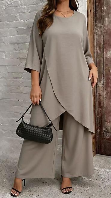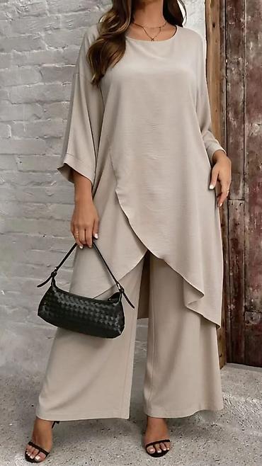 - Dizajn: duga, asimetrična tunika sa preklopljenim prednjim delom; poludugi rukavi; okrugli izrez. Pantalone ravnog, širokog kroja sa punom dužinom.