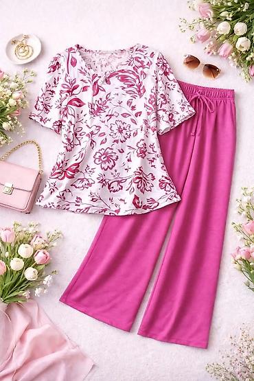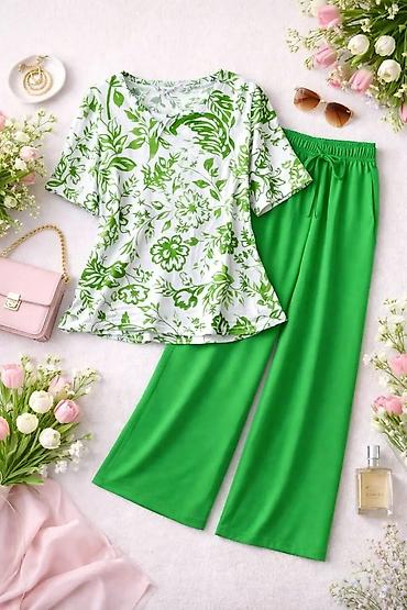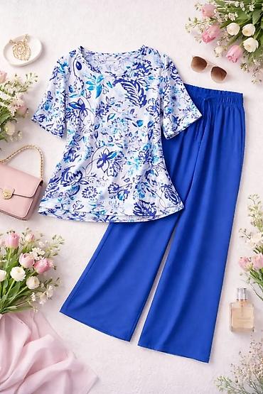 - Dvodijelni set sastavljen od lepršave bluze sa kratkim rukavima i pantalona ravnog, širokog kroja.