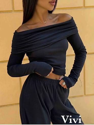 - Dizajn: elegantna bluza sa spuštenim ramenima (off-shoulder) i dugim rukavima, uparen sa ravnim, širim pantalonama elastičnog struka.