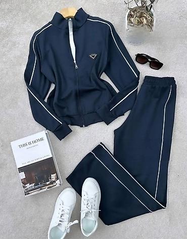 - Donji deo: ravne pantalone sa elastičnim pojasom; iste kontrastne paspul linije duž nogavica; komotan kroj za svakodnevno nošenje