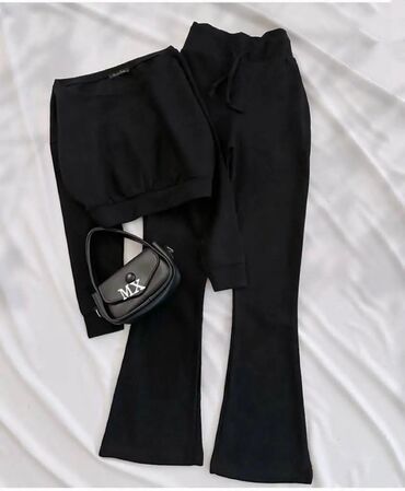 - Pantalone: visok struk sa širokom elastičnom trakom i učkurom za podešavanje; nogavice blago zvonaste/flare kroja.