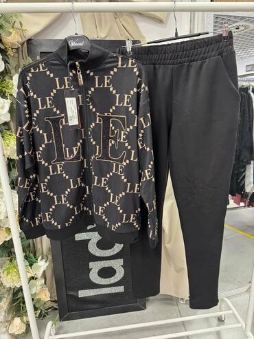 - Varijanta 4: gornji deo na rajsferšlus sa visokim okovratnikom, celoprekrivni monogram “LE”, crne pantalone bez printa.