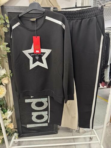 - Kroj: opuštena majica/džemper sa dužim rukavima i ravnim porubom; donji deo je klasičan jogger sa elastičnim pojasom i bočnim džepovima.