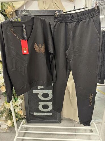 - Varijanta 3: crna majica sa V-izrezom i zlatnim aplikacijama (motiv orla i natpis “Lady Elite”), pantalone sa istim natpisom na nogavici.