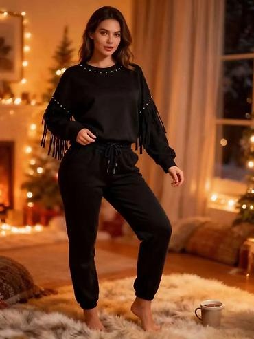 - Model: duks sa resama na rukavima i dekorativnim metalnim nitnama oko okovratnika i duž ramena; donji deo jogger kroja