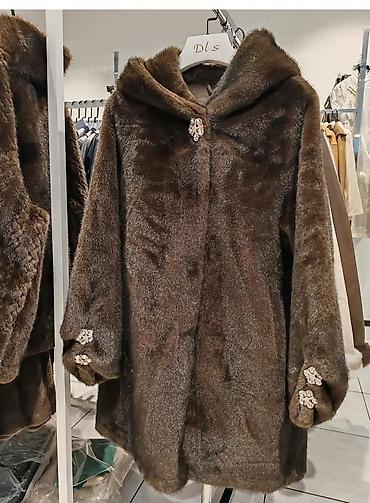 Elegantni ženski kaput od krzna u tamno‑smeđoj boji. Model srednje dužine sa kapuljačom, ravnog kroja sa laganim A-siluetom. Diskretno kopčanje po sredini, ukrašeno dekorativnom broš-kopčom pri vrhu. Na rukavima se nalaze ukrasne aplikacije sa sjajnim kristalnim detaljima koje vizuelno ističu manžetne. Mekana, gusta tekstura krzna pruža toplinu i luksuzan izgled, a unutrašnjost je postavljena za dodatnu udobnost. Idealno za svečane prilike i svakodnevno nošenje tokom hladnih dana. Boja: čokoladno smeđa. Dodatne karakteristike: