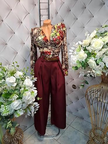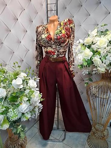- Elegantna ženska kombinacija: bluzica dugih rukava sa V-izrezom i printom (mix animal printa i cvetova u zemljanim i crvenim tonovima) + široke pantalonе visokog struka u bordo boji. Pantalone sa dubokim naborima sprеda, širokim nogavicama i dekorativnim kaišem u boji kože. Gornji deo blago nabrana ramena za istaknutu siluetu, materijal sa blagim sjajem koji lepo pada.